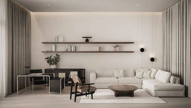 有些慵懒的家庭办公区继续延续卧室的格调,黑色的办公室储物柜和办公桌搭配白色的沙发,营造出一种平衡的单色美学。