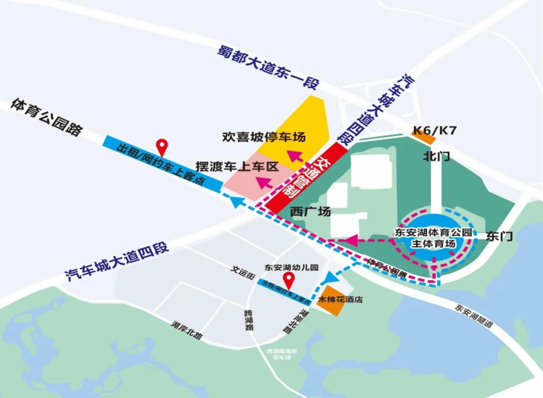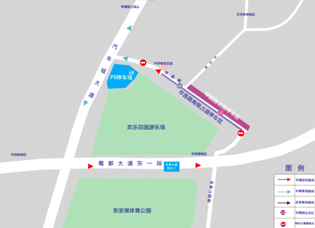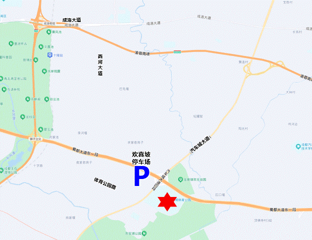 由成都方向自驾前往,遇蜀都大道出现拥堵时,建议经三环十陵立交→成洛大道→西河大道→体育公园路或经渝蓉高速龙泉驿收费站出站→汽车城大道抵达停车场。