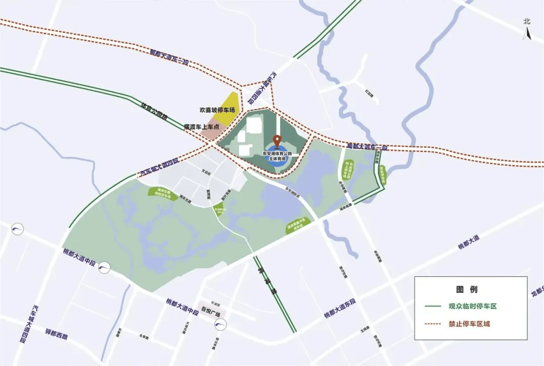 1.因散场时东安湖体育公园周边人车流量较大,请自觉服从现场交警和管理人员指挥,按照现场交通标志标识通行,共同维护交通秩序。2.汽车城大道体育公园路口进行交通管制时,需经路口往蜀都大道方向的车辆,可根据现场交警或者交通诱导牌指引驶入驿马河下穿隧道,经由桃都大道绕行。