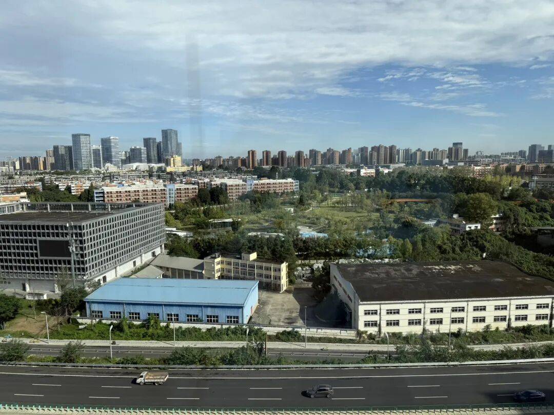 尤其是1号楼,北侧直面城东体育公园+成都理工大学+沪蓉高速,景观视野非常不错,以下是我在1栋16楼建面约125㎡户型拍摄的景观视野图。