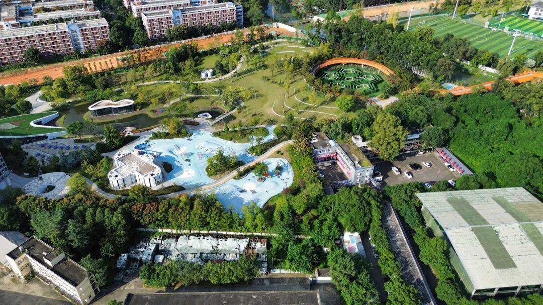 公园分两期建设,一期以足球场和湖滨休闲区为主,二期规划有乒乓球馆、儿童游乐区等多元运动设施,两期通过景观栈桥进行连接。